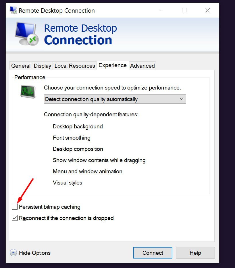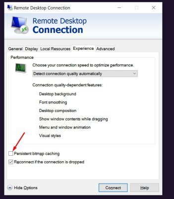 Bitmap caching — The Persistent Bitmap Caching feature is designed to speed up remote connections, but when connecting to systems with different screen resolutions, it can cause display conflicts.
