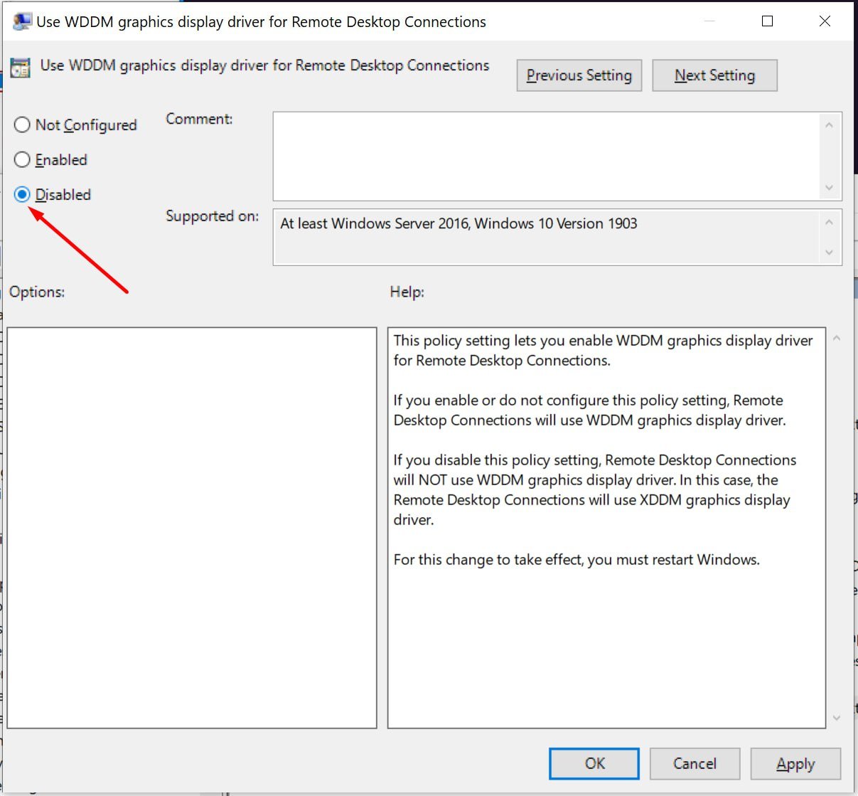 - Find the "Use WDDM graphics display driver for Remote Desktop Connections" setting