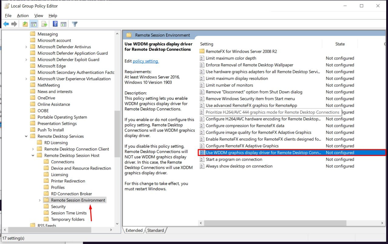 gpedit.mscand press Enter to open Group Policy Editor - In the navigation tree, follow this path: Computer Configuration → Administrative Templates → Windows Components → Remote Desktop Services → Remote Desktop Session Host → Remote Session Environment