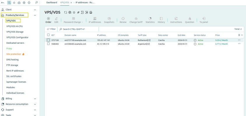 2. In the sidebar menu, open the Products/Services tab, then navigate to VPS.