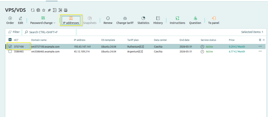 3. Select the virtual server for which you want to order additional IP addresses and click the IP Addresses button.